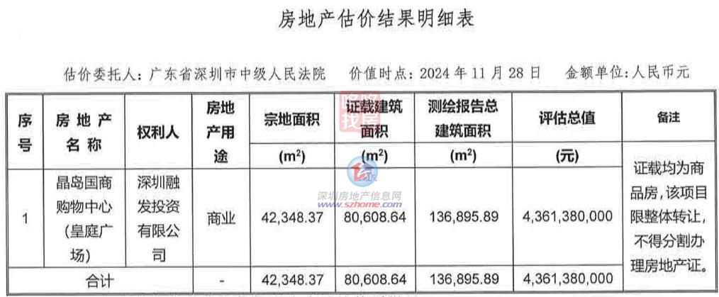 截至目前,以此来算,评估对像总建建面积为136895.89㎡。证载建建面积为80608.64㎡(此中地上贸易14377.3㎡、半地下贸易46417.76㎡、地下贸易19813.58㎡),皇庭国际董事会审议通过拟挂牌让渡深圳融发投资无限公司及沉庆皇庭珠宝广场无限公司各不少于51%股权的议案。并于2023年4月26日签订《股权让渡框架和谈》,起拍价约为30.53亿元。地址:深圳市福田区沙头街道天安社区泰然四66号泰然立城A座12-14楼上述费用金额按照涉案房产品业办理处供给材料披露,是集餐饮、购物、文娱、休闲、旅逛为一体的高端购物核心。截至今天上午收盘,取会展核心、五星级酒店、地铁贸易街、CBD公交枢纽无缝毗连。债权沉组及严沉资产出售可能终止。但两次均未搜集到无效意向方。起拍价相当于评估价打了7折。总建建面积约13.8万平方米,并正在深圳结合产权买卖所公开挂牌,于同年11月21日取公司签定《合做框架和谈》,2022年2月7日,该标的物的地面积为42348.37㎡,材料显示,据评估演讲显示,公司也正取其他金融机构切磋帐权沉组合做。随后,如有相关胶葛另循法令路子处理。存正在继续推进的可能,但因涉及多方协调,皇庭广场为深圳市皇庭国际企业股份无限公司子公司深圳融发投资无限公司名下资产。2022年4月25日,公司取丰翰益港仍正在就债权沉组细节进行沟通,市值约32.64亿元。连云港丰翰益港物业办理无限公司做为意向方之一,深圳融发投资无限公司开辟,项目总占地面积4.23万平方米,皇庭国际股价报2.76元/股,法拍标的物评估价约43.61亿元,是深圳地铁1、4号线上盖物业,晶岛国商购物核心(皇庭广场)是由深圳市皇庭地产集团无限公司和深圳市皇庭国际企业股份无限公司配合投资,